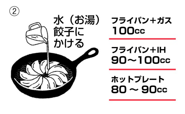 ※焼く餃子の個数やフライパンのサイズに関係なく定められた水分量を入れる。
