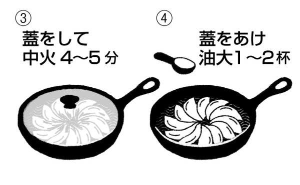 水を注いだらすぐに蓋をし4分~5分中火で蒸し焼きにする。