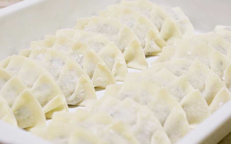 野菜と豚肉がバランスよく餡の中で混ざり合い、豚肉のうまみと爽やかな生姜の風味が間違いのないうまさとなっている。